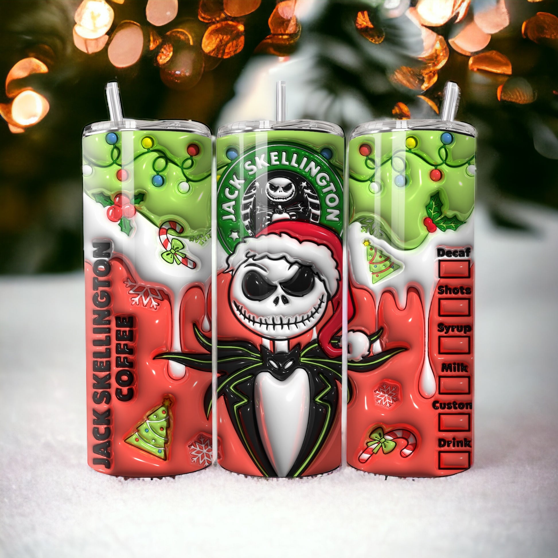 Introducing our 3D Tumbler Jack S.! Stay refreshed and jolly with Jack Skellington this holiday season. This 20 oz stainless steel cup is vacuum insulated, keeping your drinks cold or hot for 6-12 hours. The added bonus? A straw is included! Now that's spooky sipping made easy.
